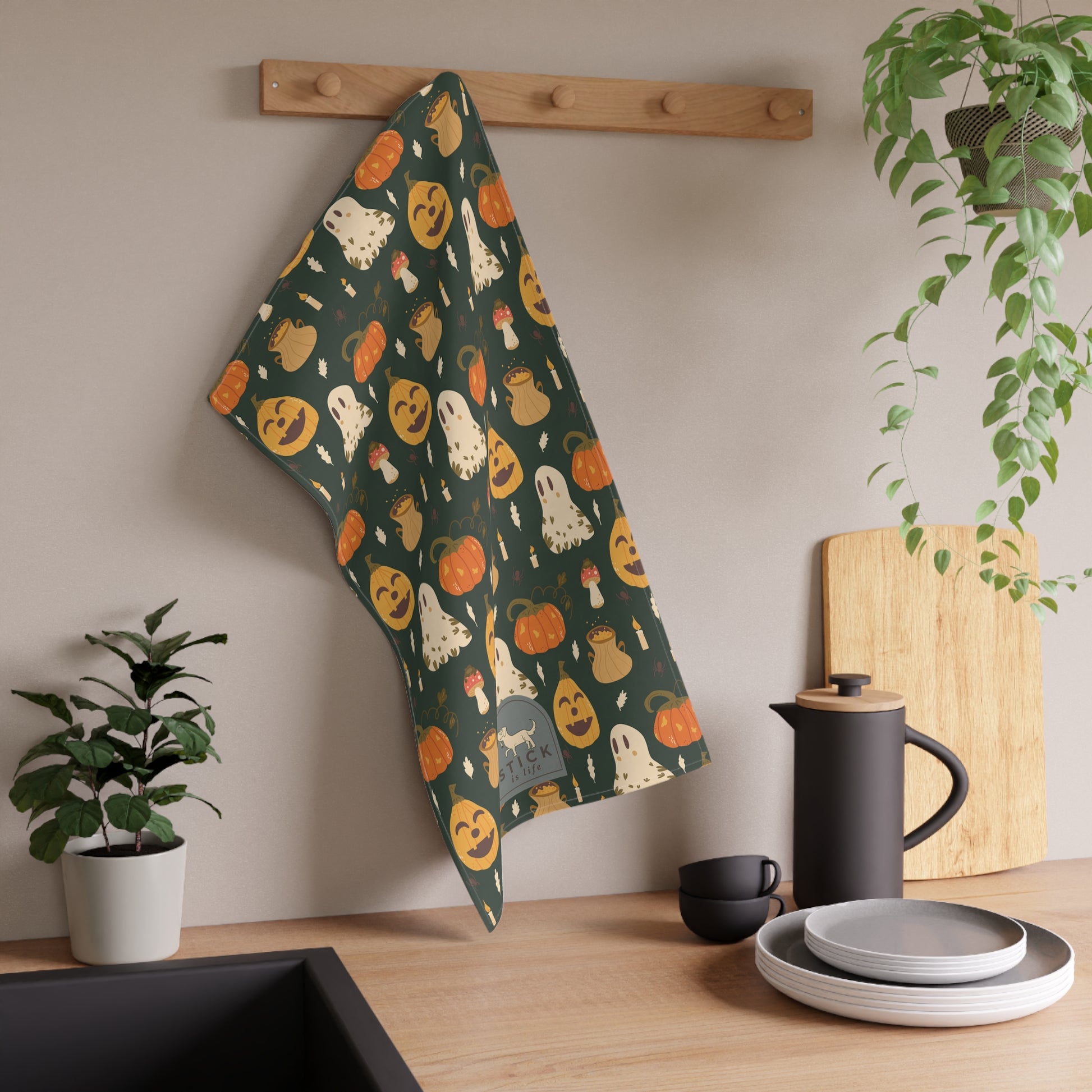 Refresh you kitchen decor with our whimsical Hallowween Tea Towel. This tea towel brings a cozy and fun fall vibe to your kitchen, perfect for Halloween celebrations. Relevant to home cooks, holiday enthusiasts, and those who love seasonal decor.